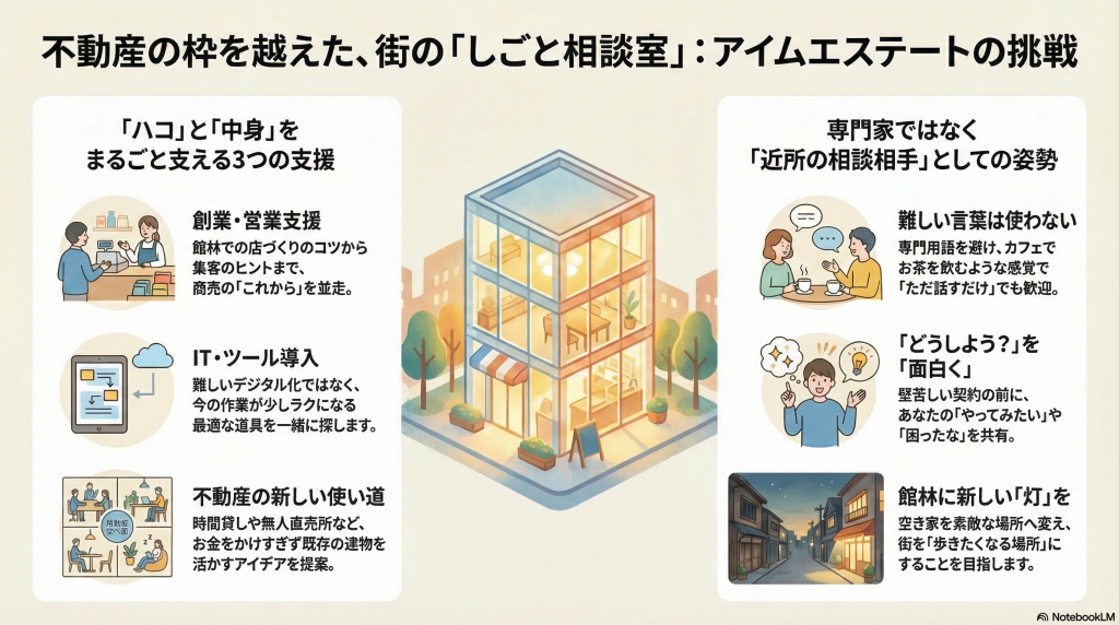 どんなに素敵な建物があっても、そこで働く人やお店が元気でなければ、街の明かりは灯りません。 だからこそ私たちは、建物を貸し借りするだけでなく、オーナー様の「商売の悩み」や、新しく事業を始める方の「最初の一歩」まで、まるごとサポートさせていただきます。
